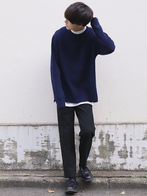 メンズに人気の青カラーのセーターにインナーとしてタートルネックを着用し、テーパードスラックスを合わせた大人メンズのキレイめコーデです。寒い日にはカシミヤジャケットを合わせるなど、アウターでコーデに変化をつけることができます。