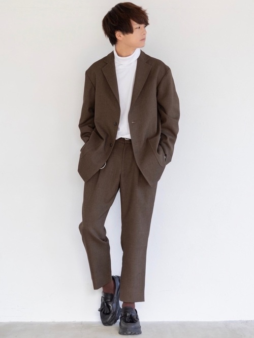 ビジネスシーンにもマッチするようなセットアップコーデ。テーラードジャケットのインナーに白のタートルネックTシャツを合わせています。大人の品を目指すなら、アウターにカシミヤジャケットなどを合わせて高級感を出すのもおすすめですよ。