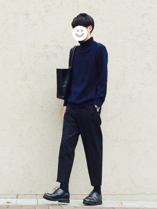 チャコールグレーのタートルネックニットをシンプルに着こなしたメンズコーデ。着飾らないラフな印象と落ち着いた大人メンズを演出しています。こちらのコーデは、カシミヤジャケットなどのアウターを合わせても様になりますよ。ワンランク上のメンズコーデを目指したいなら、カシミヤジャケットも用意してみてくださいね。