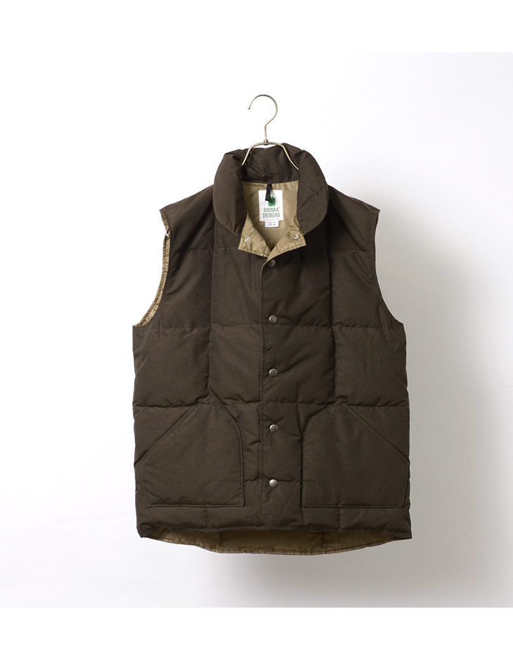 カリフォルニア発のアウトドアブランドである「SIERRA DESIGNS」。ブランド定番のダウンベストで、防水性耐久性に優れ、暖かく軽い着心地なアイテムです。ボリューム感が抑えられているので、ダボつかずすっきりとしていることも特徴となります。着こむほどに風合いが増していく素材なので、長く着用して変化していくことも楽しいですね。