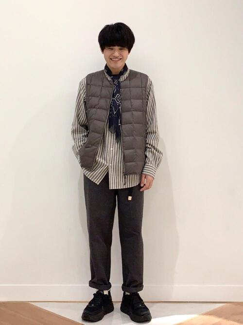 インナーダウンウェアブランド「TAION」のダウンベストコーデです。インナーではなくアウターとして羽織り中にはきれいめシャツをルーズに、グレーのパンツでスマートさを出したバランスが絶妙な着こなしです。パンツの裾をロールアップして抜け感を出すことも大切。