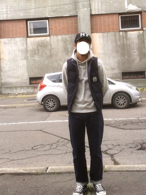 アウターウェアをメインに展開しているブランドである「FIDELITY」のダウンベストコーデです。デニムパンツにパーカーというカジュアルなシンプルコーデにベストを合わせて、ラフさを活かした着こなしです。パンツを濃い色で合わせているので、だらしないという印象は受けずリラックス感のある装いに。