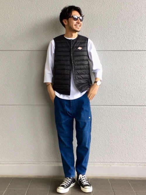 ワークウェアブランド「Danton」のダウンベストコーデです。デニムパンツにTシャツというラフな装いにダウンベストで、一味違う着こなしに。黒で引き締めた、ラフさが程よいおしゃれなコーデです。