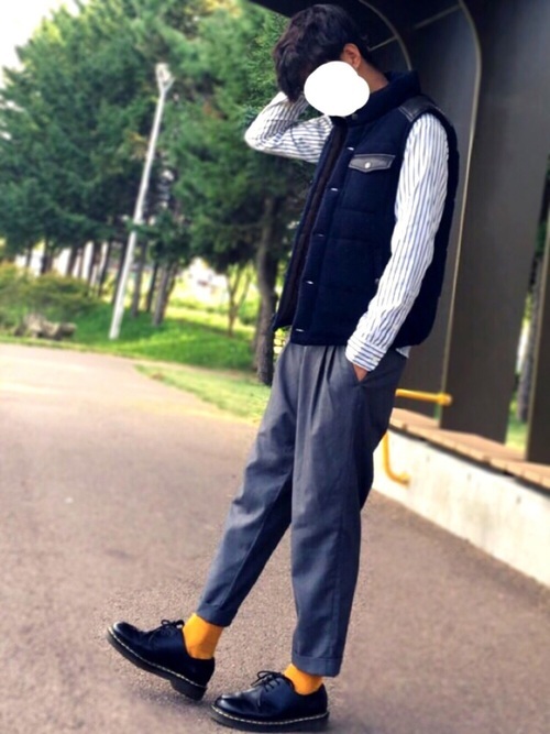 ワークウェアブランド「Dickies」のダウンベストコーデです。グレーのきれいめパンツにきれいめシャツを合わせたきちっと感のあるコーデを、ダウンベストでカジュアルダウンさせて洒落っ気のある着こなしのしています。最後に靴下のカラーで鮮やかさをプラス。