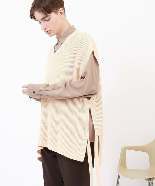 サイドに大きなスリットが入ったVネックのニットベストです。インナーにシャツやTシャツ、パーカーなどを合わせたレイヤードスタイルは今っぽさを出すのに最適なコーデ。個性的なのに合わせるアイテムを選ばないシンプルなデザインは使い勝手も抜群です。