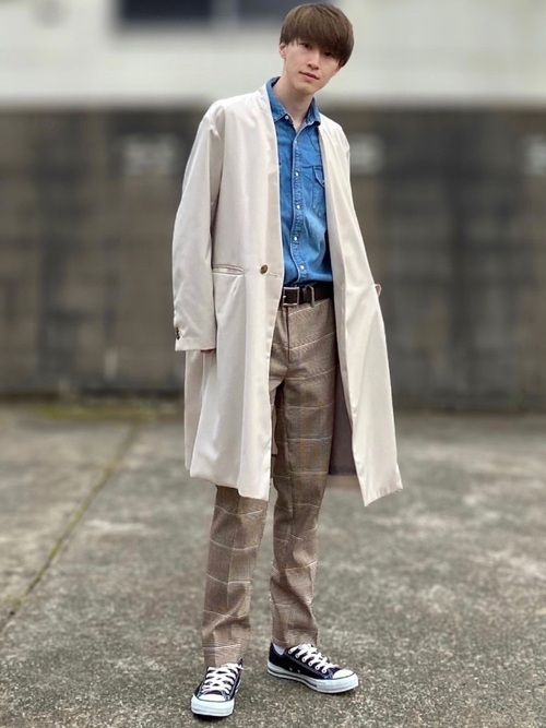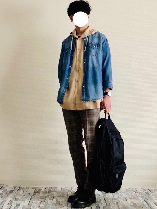 デニムシャツ×ベージュフードシャツ×チェックスラックス