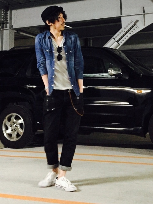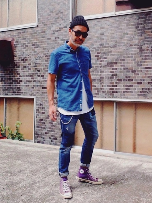 半袖のデニムシャツと適度に色落ちしたジーンズのブルーのグラデーションとパープルの色合わせが新鮮なメンズコーデ。インナーの白がクリーンな抜け感をもたらしています。ロールアップしたジーンズとハイカットスニーカーのバランスも絶妙です。サングラスとニットキャップでコーデが引き締まり、大人ならではのかっこよさのある着こなしに仕上がっています。
