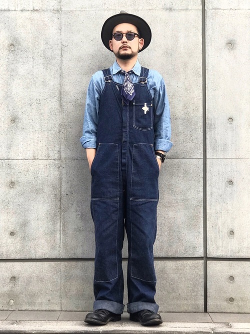 デニムシャツにオーバーオールを合わせたデニムonデニムのワークスタイル。ライトブルーと濃いインディゴブルーのグラデーションがこなれたムードをかもし出しています。襟元に巻いたネイビーのバンダナが主張し過ぎず程よいアクセントに。ハットとサングラスがこなれ感をプラス。