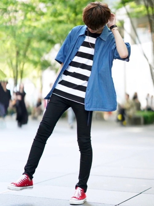 さわやかに見える定番のデニム×ボーダー。ワイドなモノトーンのボーダーなのでコントラストが際立ち、黒スキニーを合わせることでよりスッキリ見えます。赤のスニーカーでカジュアルダウンして春らしいアクティブ感も。