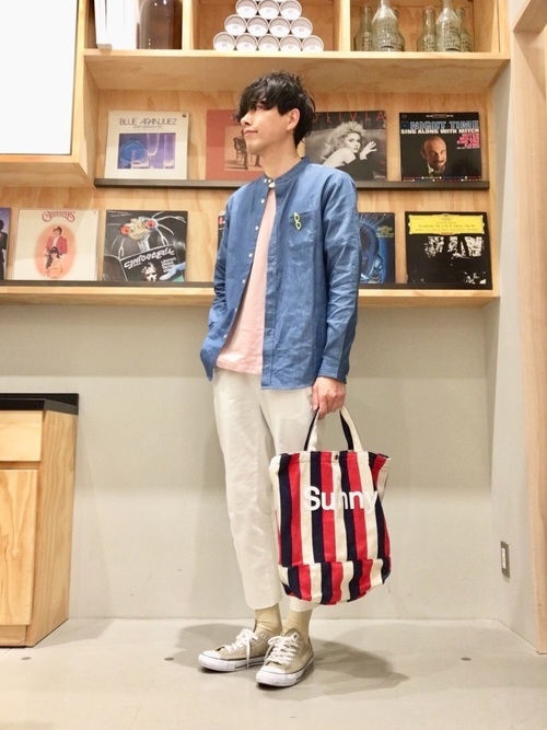 明るいネイビー×ピンク×ホワイトの春らしい色合いのメンズコーデ。バンドカラーシャツとアンクルパンツでスッキリしたシルエットに。ポケットに挿しためがねピンとストライプのバッグがアクセントに。