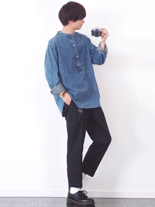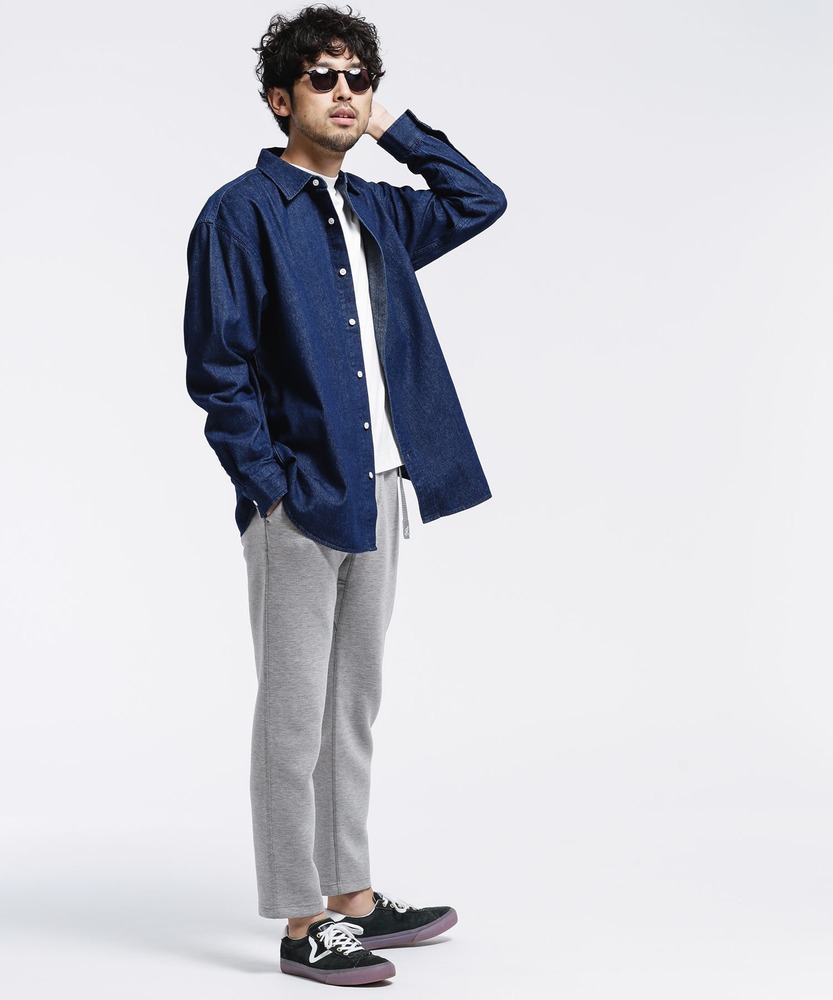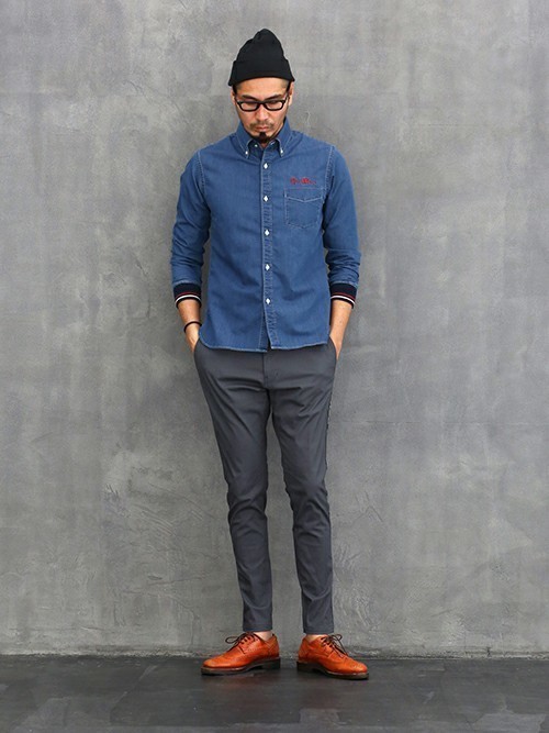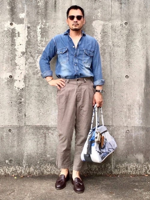 デニムシャツ×グレーテーパードパンツ