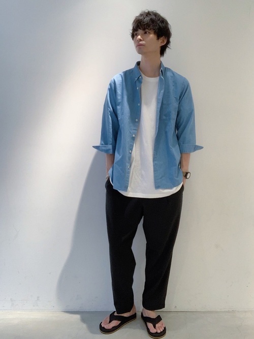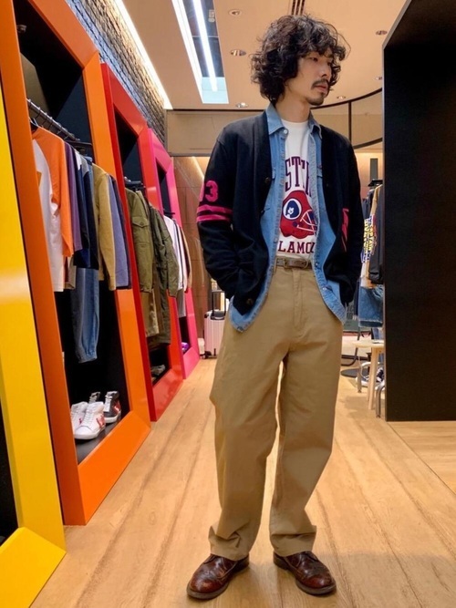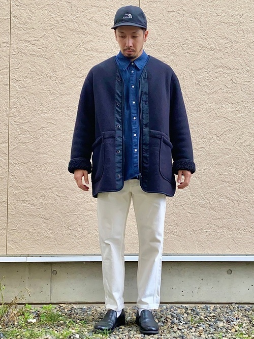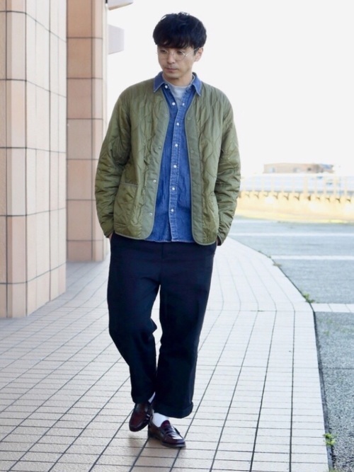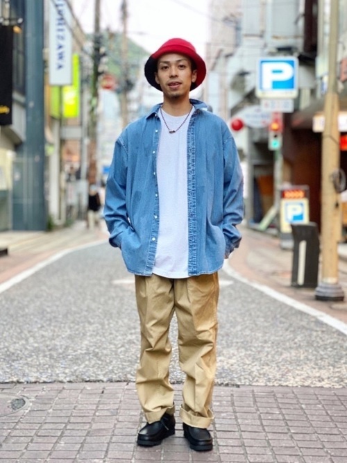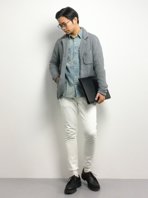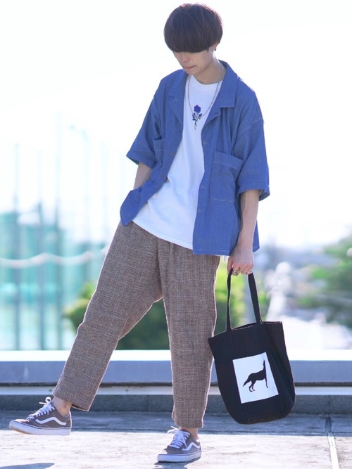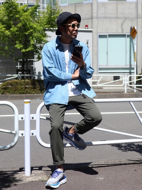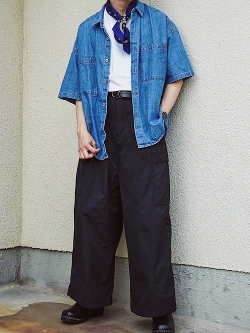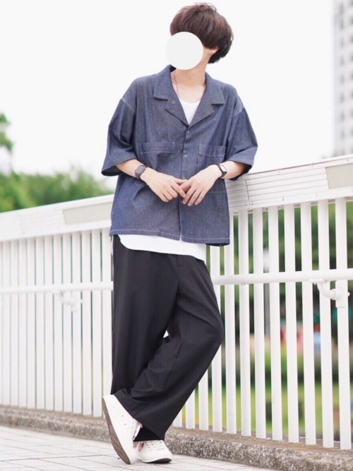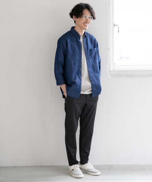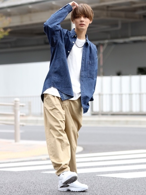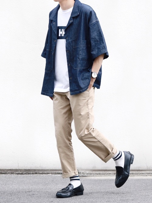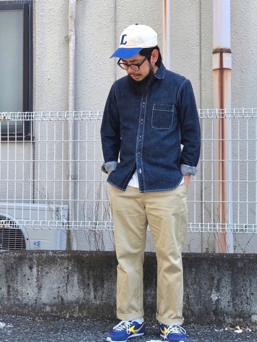 ヴィンテージのような風合いを持つデニムシャツとワイドチノパンのカジュアルコーデ。デニム特有の無骨さもあるデニムシャツですが、一つポケットのシンプルなデザインと品を感じさせる濃紺カラーでスッキリとした印象のコーデに仕上がっています。袖のロールアップと白のインナーで抜け感もプラス。