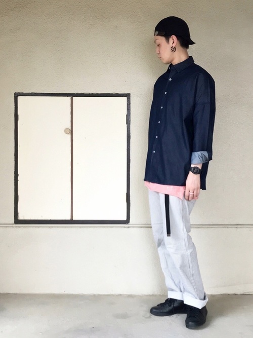 ドロップショルダーでビッグシルエットのデニムシャツ×ピンクのビッグTシャツ×ヒッコリーのワイドパンツのメンズコーデ。デニムシャツを前閉じで着ることによって、リラックスしたシルエットの中にきちんと感のある着こなしに。ロールアップが抜け感とこなれ感を演出しています。黒で統一した小物も効果的です。
