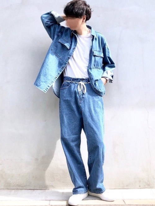 デニムシャツ×白インナー×デニムパンツ