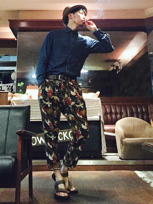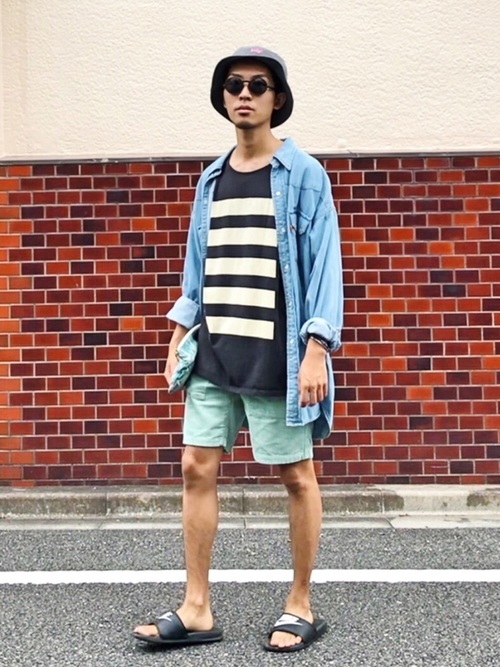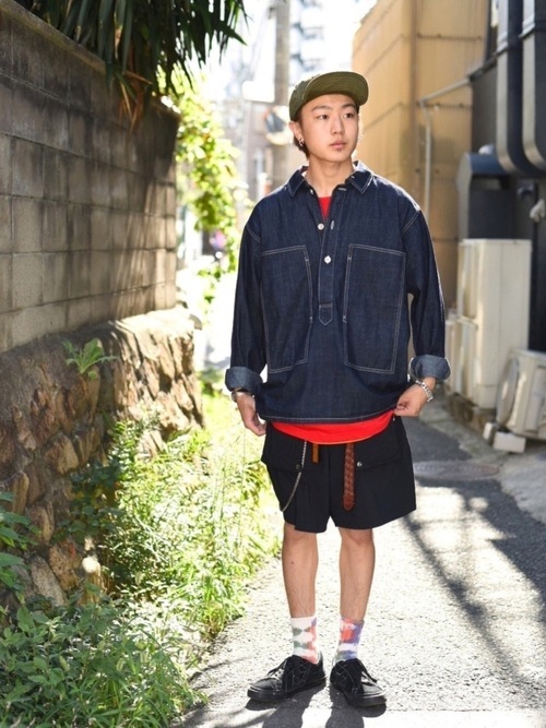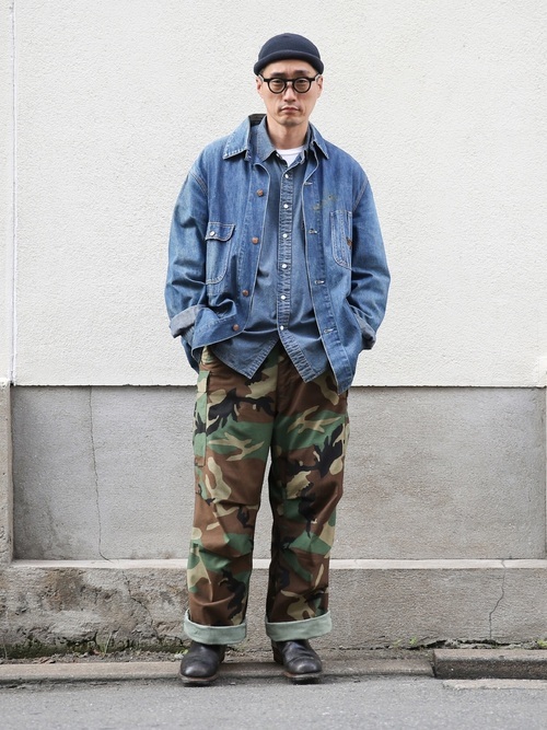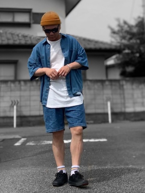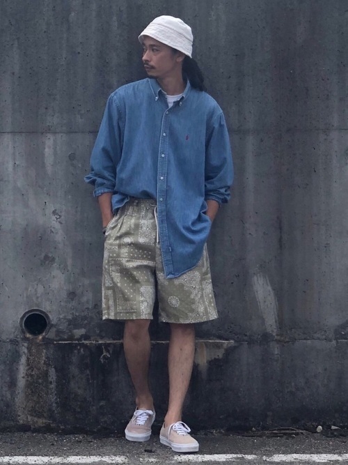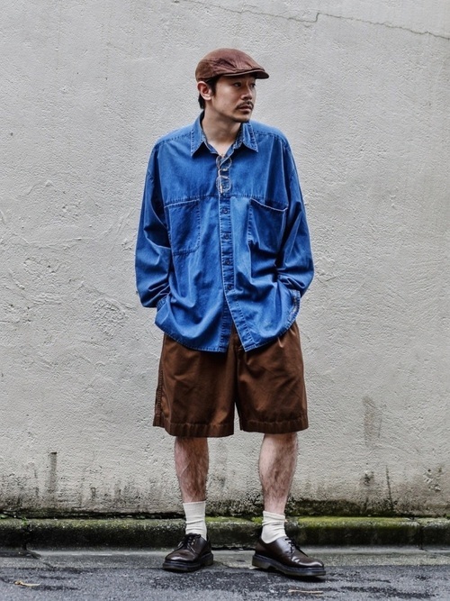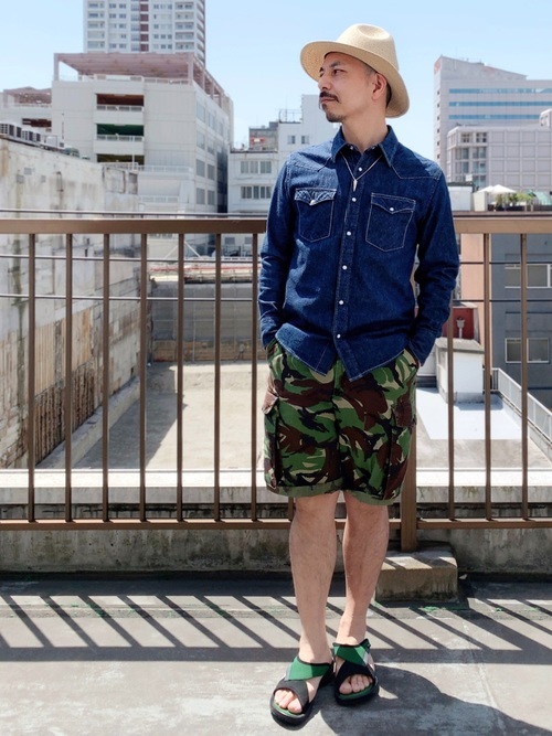 デニムシャツ×カモフラージュ柄ショーツ