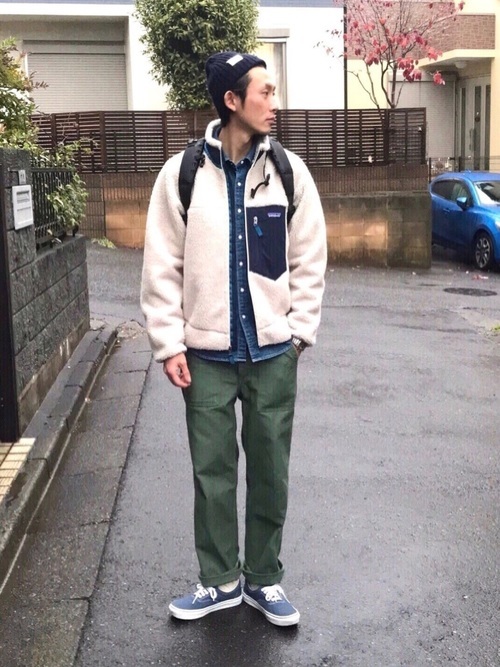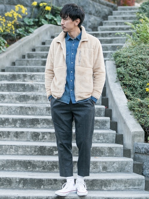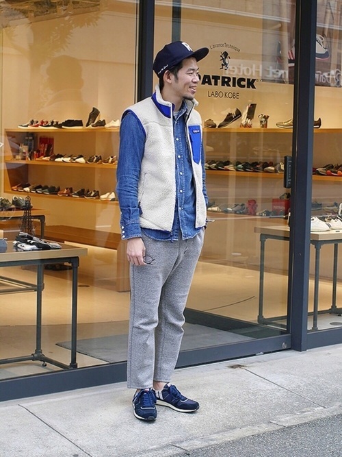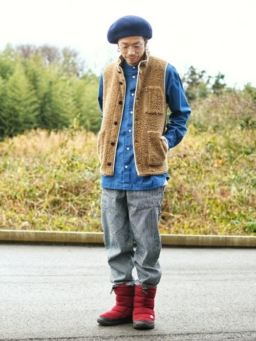 デニムシャツ×白フリースベスト×グレーパンツ