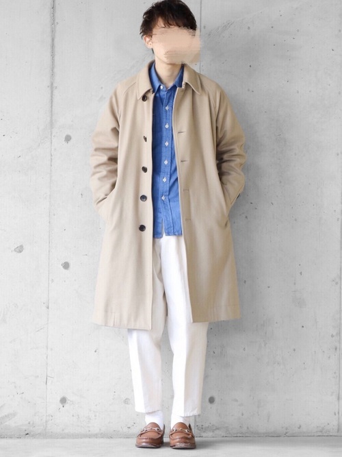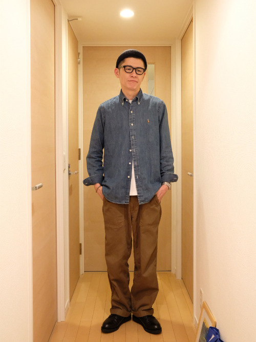 デニムシャツ×白インナー×ベージュチノパン