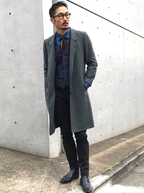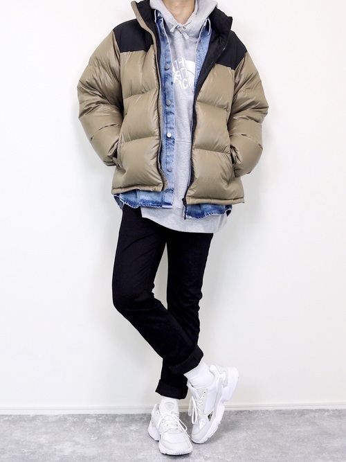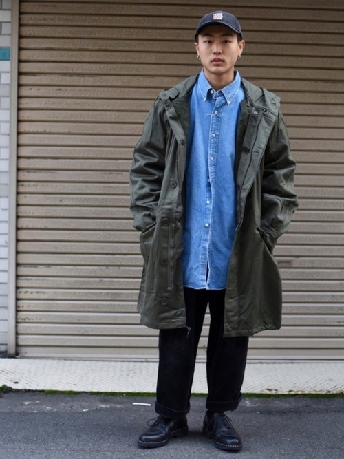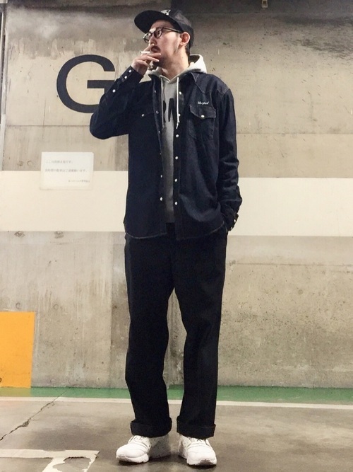 デニムシャツ×グレーパーカー×黒パンツ
