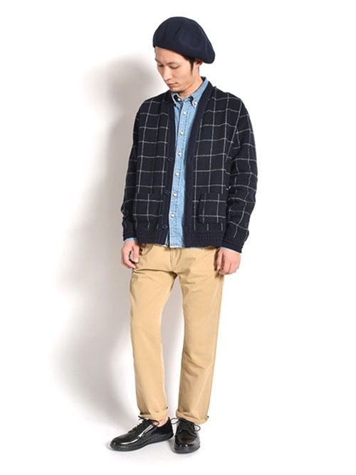 トラッドな印象のウィンドウペンのカーディガン×ベージュチノパンにデニムシャツがカジュアル感をプラス。品のよさとラフさのバランスが整った大人のきれいめカジュアルに仕上がっています。