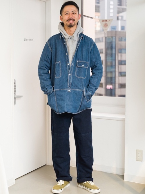 程よいビッグシルエットと長めの着丈でボトムを選ばず、ショートブルゾンなどとのレイヤードスタイルのインナーとしても活躍する一着。12オンスの程よい厚みのデニム生地で、ストーンバイオ加工を施したヴィンテージのような風合いが特徴です。