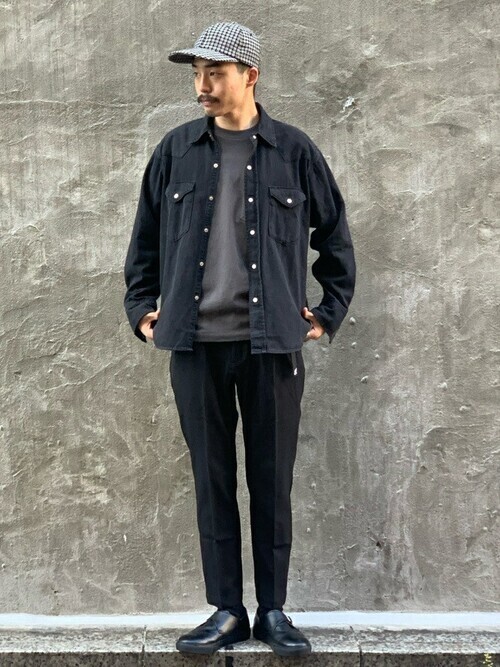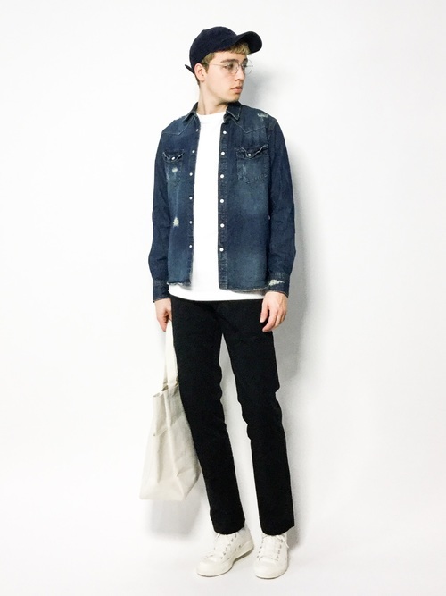 ダメージ加工のウェスタンデニムシャツが目を引くメンズコーデ。ネイビー×モノトーンのすっきりした着こなしです。きれいなIラインシルエットで、シンプルで洗練された印象のきれいめカジュアルに仕上がっています。