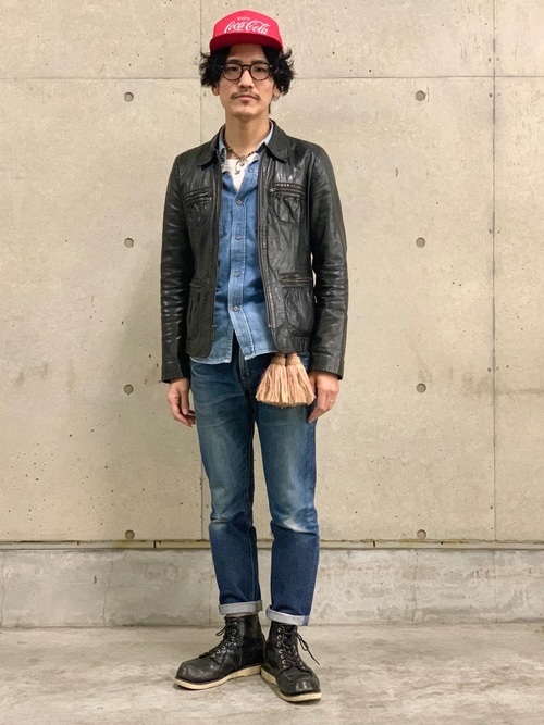 デニムonデニムコーデにレザージャケットを重ねたアメカジスタイル。上下細身のシルエットなので無骨になりすぎず、スタイリッシュなコーデに仕上がっています。タッセルのアクセサリーと赤のキャップで個性が光る着こなしに。