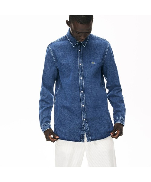 レギュラーフィットでヘビーオンスのシンプルなデニムシャツ。光沢のあるスナップボタンがエレガントなアクセントになっています。左胸にはワニのブランドロゴを刺繍。伝統的なフレンチブランドならではのクラシカルな魅力のある一着です。