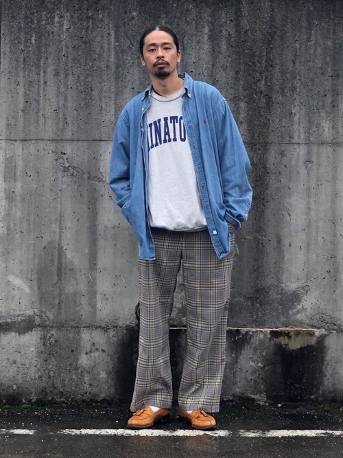 オーバーサイズのデニムシャツとチェックのワイドパンツのリラックス感のあるメンズコーデ。シックなチェックのワイドパンツときれいめシューズがデニムシャツとスウェットのカジュアル感を中和して大人のこなれ感をかもし出しています。