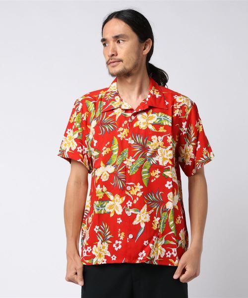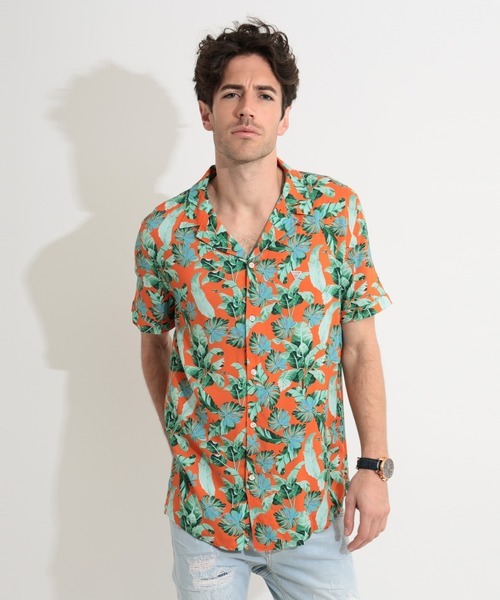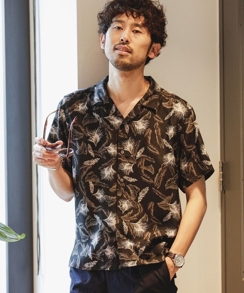 トロピカルなハイビスカスは、アロハシャツの定番と言っても過言ではありません。レーヨン素材を使った半袖のオープンカラーシャツは、厚い真夏にサラッと羽織るのにおすすめですよ。サーフスタイルにピッタリの1枚です。