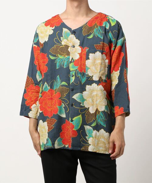 全体に色鮮やかな牡丹が描かれた和柄のシャツになります。襟のない丸首というデザインが珍しいですね。半袖でも長袖もない7分袖というのも魅力的です。“ちょい悪”な大人の男性に着こなしてほしい1枚ですよ。