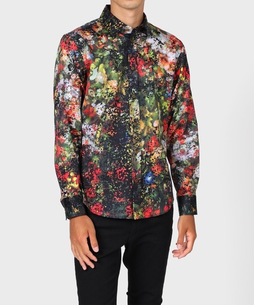 3つの花瓶に入ったブーケを全体にプリントした、アート性に富んだ花柄シャツになります。クラッシックなデザインなので、ジャケットの中に着てもおしゃれですよ。ブラックジーンズあたりと合わせて、クールに着こなしたいですね。