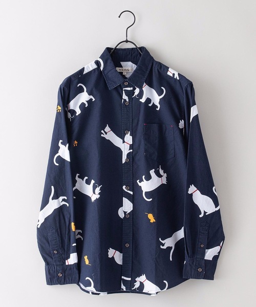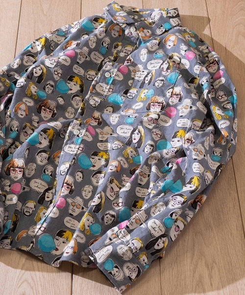 生地全体に人の顔や吹き出しコメントが描かれていて、遊び心溢れる総柄シャツになります。ジーンズやチノパンと合わせてアメカジ風な着こなしたいですね。他にもクマや猫が描かれているモデルもあって、思わずまとめ買いしたくなる1枚ですよ。