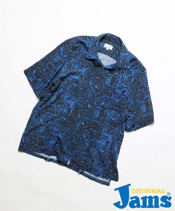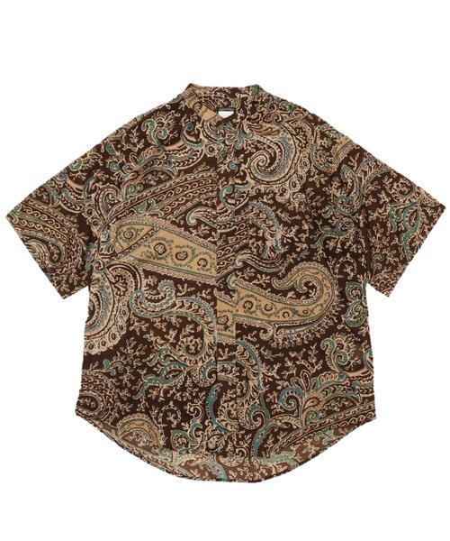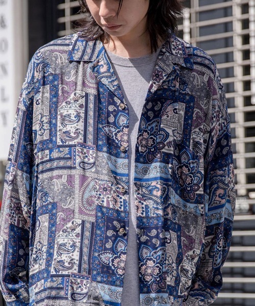 ペイズリーや幾何学模様など、色んな柄を組み合わせたユニークなデザインの総柄シャツになります。見た目がパッチワークシャツみたいでおしゃれですよね。オープンカラーシャツなので、Tシャツと合わせると着こなしが上品に仕上がりますよ。