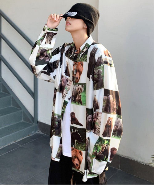 リアルな熊の写真が生地全体にプリントされたシャツになります。何とも大胆かつ斬新なデザインですが、愛嬌があっていいですね。ビッグシルエットなので細身のパンツと合わせてもおしゃれだし、ワイドパンツと合わせてゆるコーデにするのもおすすめですよ。