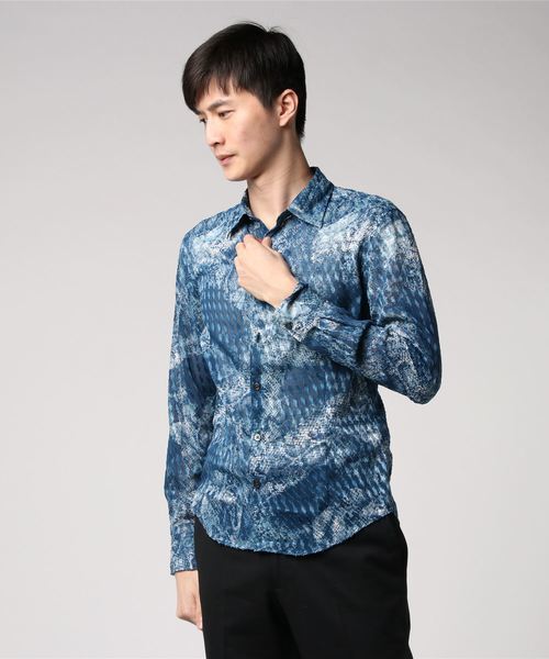バイヤスダイヤ柄のジャガード生地にパイソン柄をプリントしたシャツになります。ワイルドにもエレガントにも見えるところが魅力的ですね。透け感のあるポリエステル素材が使われているので、長袖だけど夏場にサラッと羽織っても良さげですよ。