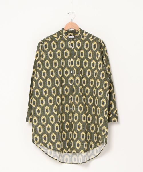 鮮やかな幾何学模様が目を惹く、バンドカラーシャツになります。前後の丈の長さが異なる造りになっているので、中からTシャツをちょい見せさせるのもおしゃれですよ。職人が手作業でワックスプリントを施しているだけあって、色鮮やかな柄が魅力的です。