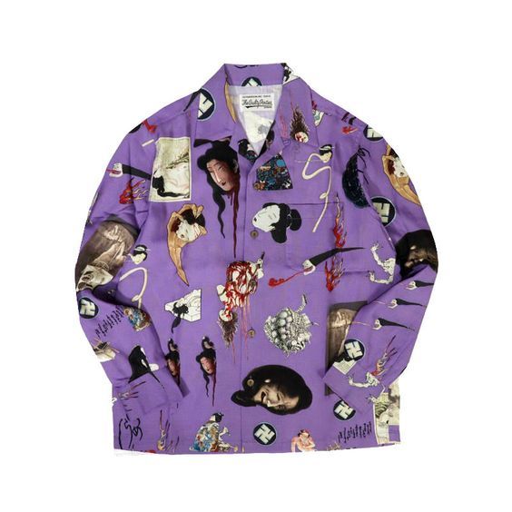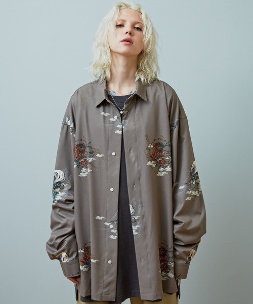ドレープ感のある生地に風神雷神がプリントされた、スカジャン風デザインの長袖シャツになります。落ち着いた色合いなので、ジーンズだけじゃなくスラックスと合わせてもカッコよさげですね。こちらはユニセックス仕様となっており、カップルで着ていただくのにもおすすめの1枚です。