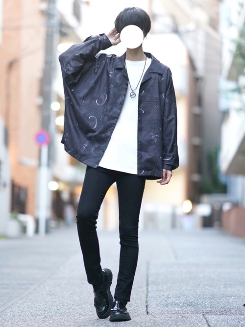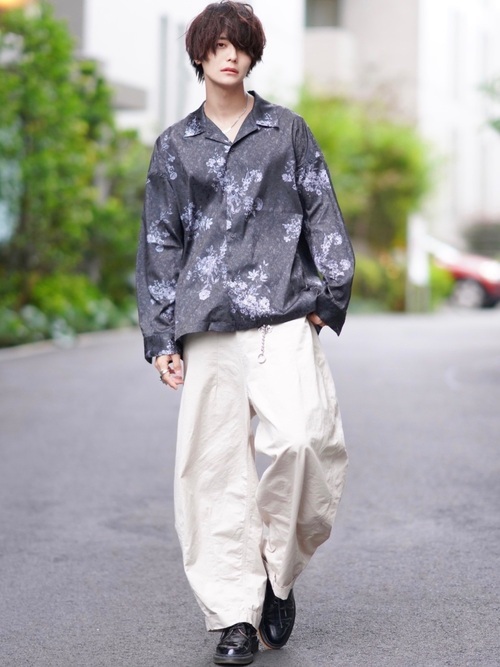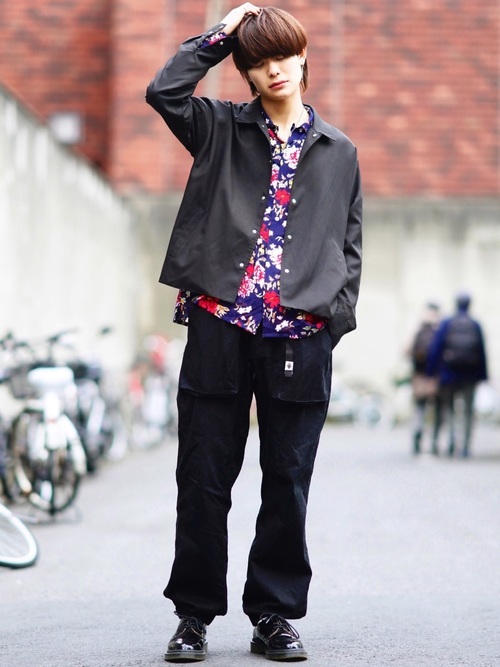 全体的に黒一色でまとめながらも、ブルゾンの中に花柄シャツを着ることでインパクトのある仕上がりになっているのが見て取れます。他のアイテムが単色なだけに、シャツの花柄が一層引き立って見えますね。