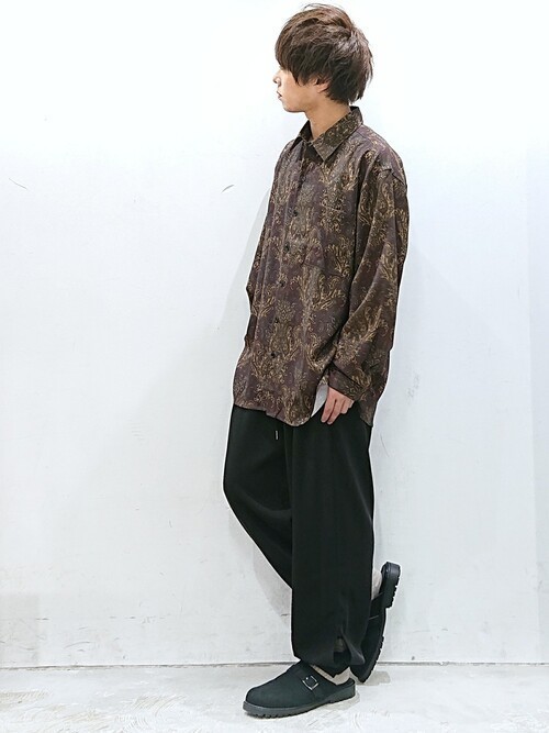 インテリアに良く使われるダマスク柄が生地全体に施されたシャツに黒のパンツを合わせて、とても上品な雰囲気をかもちだしてますよね。パンツのシルエットとサンダルでゆる感を演出しているところが、個性的でおしゃれですよ。