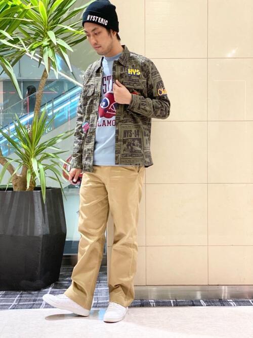 ミリタリー風な総柄シャツにチノパンを合わせたアメカジコーデがおしゃれな彼。上から下まですべてヒステリックグラマー製のアイテムでまとめているところに、並々ならぬこだわりを感じます。