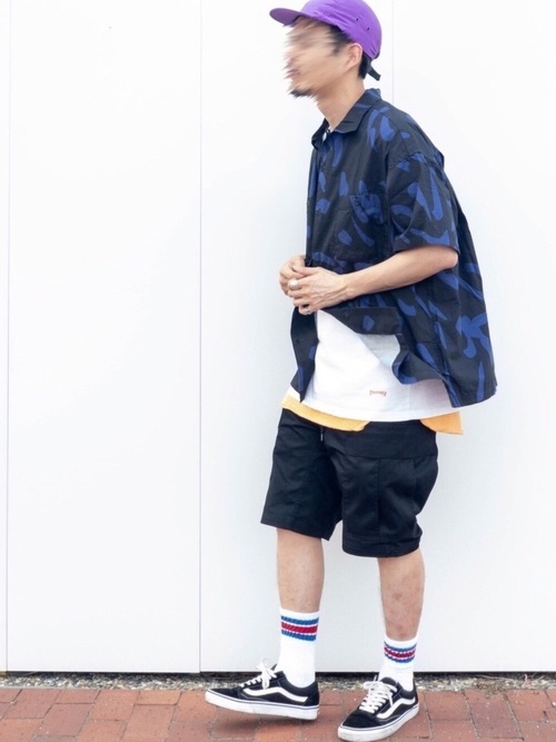 PUBLUX製の総柄オープンカラーシャツに同系色のカーゴショーツ&スニーカーといった組み合わせが、とてもカジュアルでおしゃれに見えますね。Tシャツとの重ね着もバッチリきまってますよ。