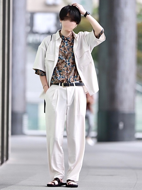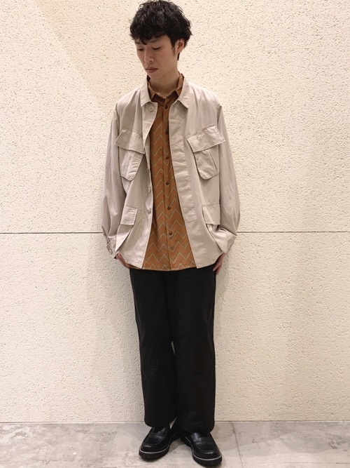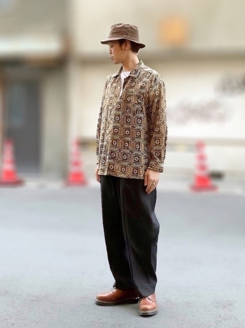 こちらは、シャツジャケットのインナーにバティック柄のシャツを組み合わせたコーデになります。上半身を暖色系に、そして下半身をモノトーンにまとめたカラーコーディネートが上手いですね。