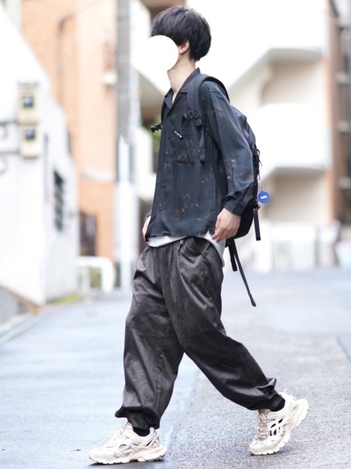 ダークカラーの花柄シャツにベージュのバルーンパンツを組み合わせて、ゆるコーデながらも上品でおしゃれに仕上がっているのが見て取れます。落ち着いた色合いの花柄シャツだと、コーデしやすそうですね。