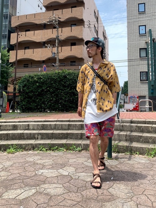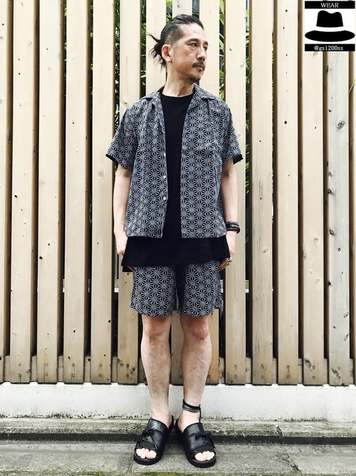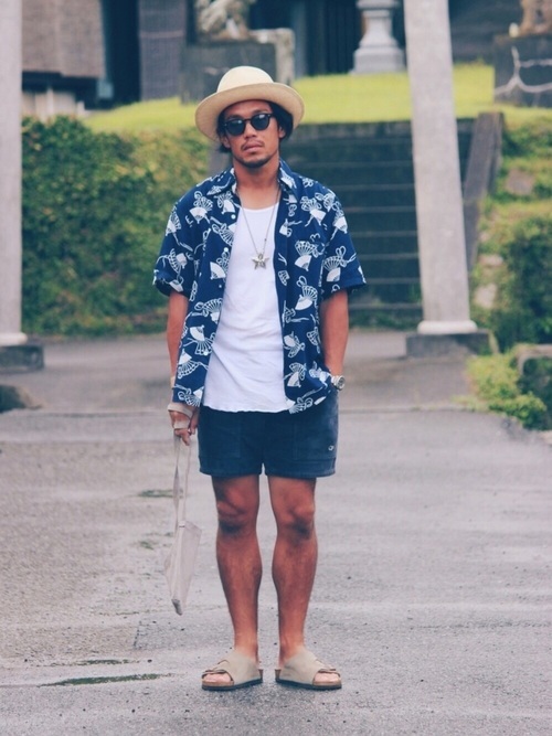 大人の雰囲気が漂うこちらの彼が着ているのは、EVISU製の麻の葉柄オープンカラーシャツとショートパンツのセットアップになります。中に着ている黒のTシャツとレザーサンダルの組み合わせが、シンプルでおしゃれですね。