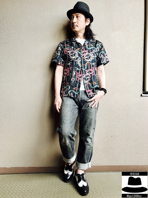 国産ジーンズブランドとしておしゃれ好きの間でも有名なEVISU(エヴィス)のヘビ柄ハワイアンシャツを使ったコーデになります。ヴィンテージ感を漂わせながらも全体的にちょい悪なコーデに仕上がっていて、とてもおしゃれですよね。