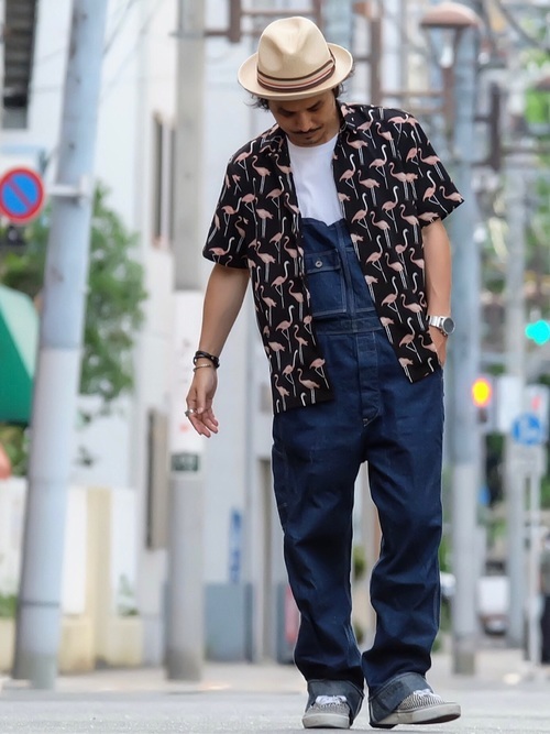 大胆にも生地全体にフラミンゴがプリントされたシャツを、オーバーオールと組み合わせて大人カジュアルな着こなしに仕上がってますね。こういう大胆なデザインの柄シャツは、ジーンズやブーツと合わせればアメカジ風な仕上がりになってカッコいいですよ。