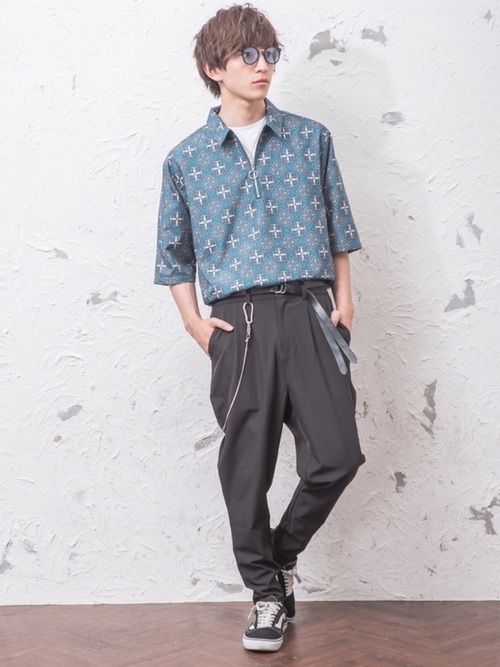 バティック柄のハーフZIPシャツをパンツにタックインさせて、クールでスマートな着こなしに仕上がってますね。シャツが半袖なので、夏場だとショートパンツと組み合わせればより爽やかな印象に仕上がりますよ。