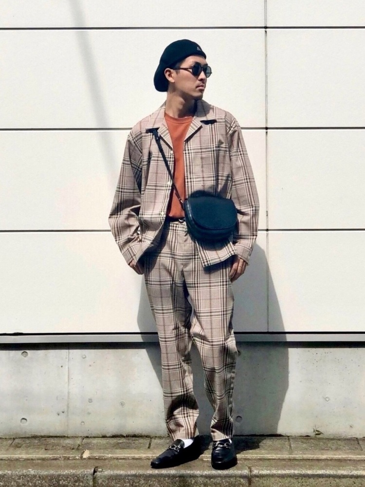 チェックのセットアップにダークオレンジのカラーTシャツを合わせたコーデです。カラーアイテムを取り入れたいけれど、難しいイメージがあって取り入れづらいという方には、色味が近いカラーでトータルコーデを組無のがおすすめ。カラーアイテムの主張が程よく、手軽におしゃれな着こなしになります。