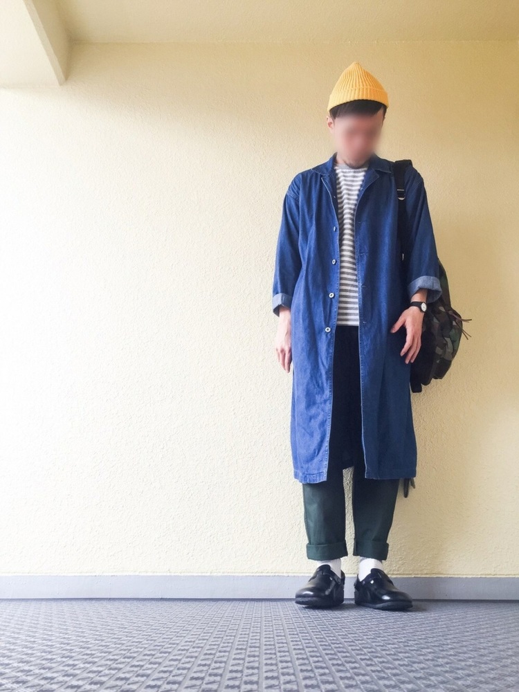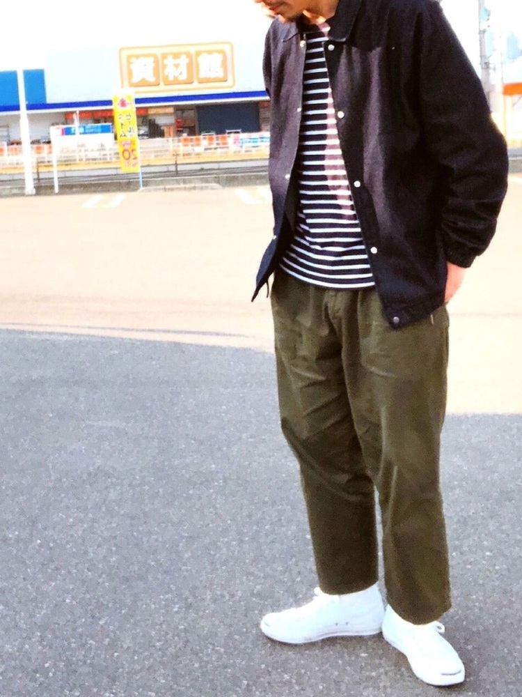 キャップ、マウンテンジャケットといったスポーティーなアイテムとボーダーTシャツを合わせたコーデ。ボーダーTシャツはアウター類との相性が良いので、このような組み合わせはおすすめです。首元のボタンを止めてネック周りを隠すことで、よりメンズライクなかっこいい雰囲気になっています。