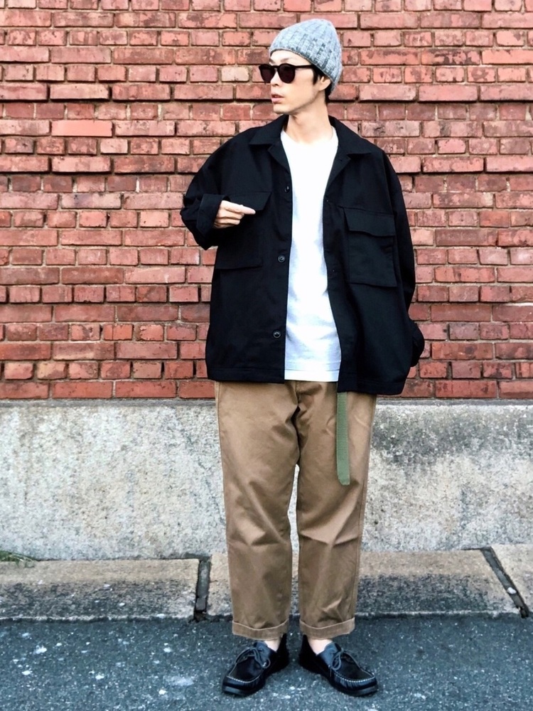 トータルのカラーバランスが絶妙な大人のコーデです。ここでも、シンプルなクルーネックTとチノパンの組み合わせの人気は健在。黒のシャツジャケットをオンすることで、コーデが引き締まり落ち着いた印象に。